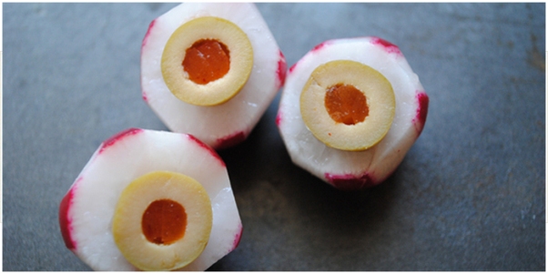 any party. Simply peel a radish, leaving part of the red skin on, slice off the